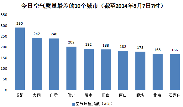 人民网北京5月7日电 (杨翼) 根据环保部公布的最新数据,截至今天早上7时,成都的AQI(空气质量指数)为290,属于重度污染,成为161个参与空气质量排名的城市中空气质量最差的城市。今日空气质量最差的10个城市分别是成都、大同、自贡、保定、衡水、邢台、唐山、廊坊、北京和石家庄。