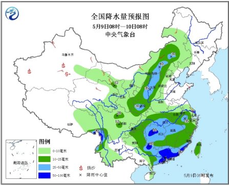 人民网北京5月9日电 (杨翼)今晨6时,中央气象台继续发布暴雨蓝色预警。本周末,受北方冷空气和南方暖湿气流的共同影响,我国中东部大部地区都将出现一次明显的降雨过程,对大家的外出游玩会产生不利影响。