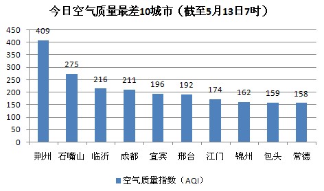 人民网北京5月13日电 (蒋琪) 根据环保部公布的最新数据,截至今天早上7时,荆州的AQI(空气质量指数)为409,属于重度污染,成为161个参与空气质量排名的城市中空气质量最差的城市。今日空气质量最差的10个城市分别是荆州、石嘴山、临沂、成都、宜宾、邢台、江门、锦州、包头、常德。成都的AQI为211,属于重度污染,已连续两日入围空气质量最差十城市。