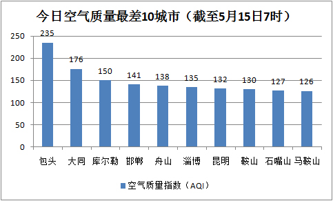人民网北京5月15日电(李楠桦)根据环保部公布的最新数据,截至今天早上7时,包头的AQI(空气质量指数)为235,属于重度污染,成为161个参与空气质量排名的城市中空气质量最差的城市。今日空气质量最差的10个城市分别是包头、大同、库尔勒、邯郸、舟山、淄博、昆明、鞍山、石嘴山和马鞍山。