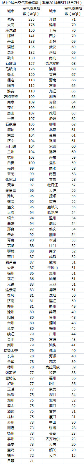 说明:自2014年1月1日起,环保部发布空气质量实时信息、空气质量月报及参与空气质量排名的地级城市已由74个增加到161个,包含了直辖市、省会城市、计划单列市、“三区”所有地级城市、环保重点城市和环保模范城市。人民网环保频道将采用环保部的官方数据,对161个城市每日空气质量进行排行。