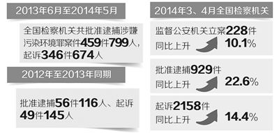 来自最高检的统计数据显示,从2013年6月至2014年5月,全国检察机关共批准逮捕涉嫌污染环境罪案件459件799人,起诉346件674人,相比2012年至2013年同期的批准逮捕56件116人、起诉49件145人,办案数量大幅度提升。