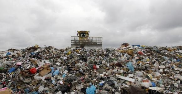图片说明:布拉格附近的一个垃圾场内,一辆垃圾车正在铲起包括塑料制品在内的各种垃圾。