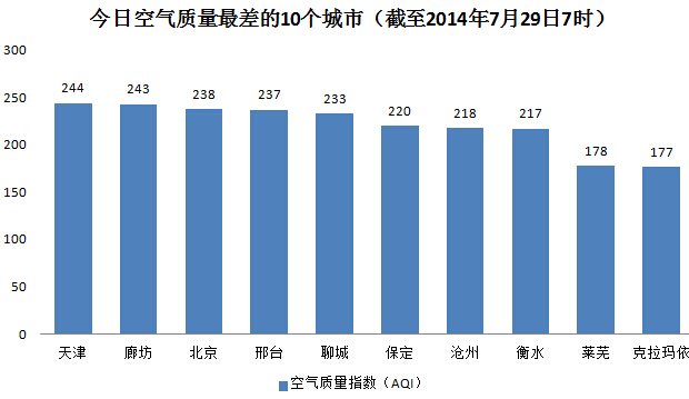 人民网北京7月29日电 (杨翼)根据环保部公布的最新数据,截至今日早上7时,天津的AQI(空气质量指数)为244,属于重度污染,成为161个参与空气质量排名的城市中空气质量最差的城市。今日空气质量最差的10个城市分别是天津、廊坊、北京、邢台、聊城、保定、沧州、衡水、莱芜、克拉玛依。