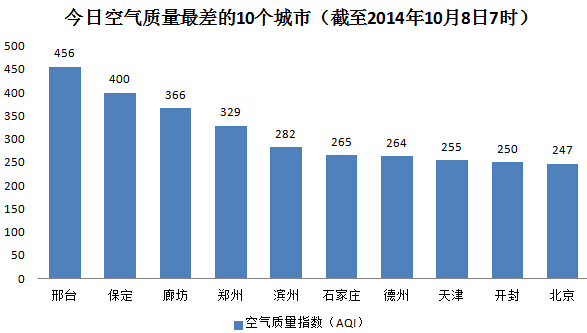 人民网北京10月8日电 (杨翼)根据环保部公布的最新数据,截至今天早上7时,邢台的AQI(空气质量指数)为456,属于严重污染,成为161个参与空气质量排名的城市中空气质量最差的城市。今日空气质量最差的10个城市分别是邢台、保定、廊坊、郑州、滨州、石家庄、德州、天津、开封和北京,七成属于京津冀地区。
