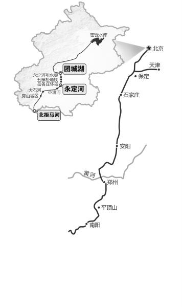 南水水流可能要走15天的路程进入北京市的接水管道。准确地说,南水北调中线工程不但要给北京输送,还要给沿线的河南、河北、天津输水,水流从湖北丹江口水库经河南、河北等地,最终到北京,全长要走1276公里。其中,南水北调的北京输水路径是从房山的北拒马河进入,终点到达颐和园的团城湖。