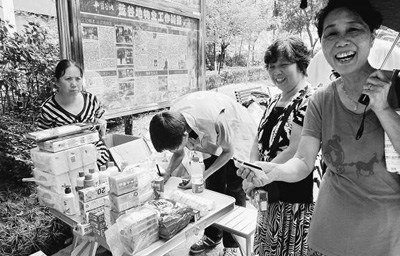 居民郑素琼看到很多邻居拿着纸盒、塑料瓶等来换礼品,她把重重的购物袋依靠在桌腿边,向张立兴打听。