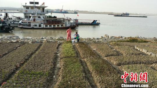 图为位于江西九江湖口县境内的石钟山下,因水位下降,裸露的岸堤变身“菜地”。 姜涛 摄