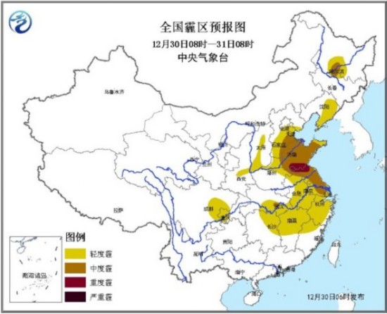 人民网北京12月30日电 (杨翼)中央气象台继续发布大雾黄色预警:预计,今天早晨到上午,山东南部、江苏大部、安徽中北部和皖南山区、浙江西部、湖北东部、湖南西部和东北部、江西大部、福建西北部、四川盆地中北部等地有大雾,其中,江苏北部、安徽北部、湖南东北部、江西中部、浙江西南部及福建西北部等6省部分地区有能见度不足500米的浓雾,局地有能见度不足200米的强浓雾。今天白天,华北东南部、黄淮东部、江淮东部、江南北部有轻到中度霾,局地重度霾。