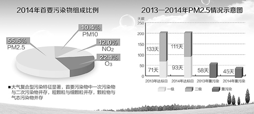 2014年首都的空气质量,既有“APEC蓝”的清爽,也有10月的连续重污染,总趋势是全年持续改善。四项主要污染物浓度同比平均下降3.3%。PM2.5年均浓度85.9微克/立方米;全年一级优天数93天,较2013年增加22天;PM2.5导致的重污染天数,从2013年的58天下降为45天,减少了13天。