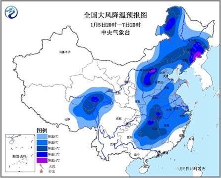 人民网北京1月5日电 (蒋琪)中央气象台1月5日18时继续发布寒潮蓝色预警:受强冷空气影响,预计5日20时至7日20时,我国中东部大部地区将先后出现大风降温天气,气温普遍下降6~10℃,其中,内蒙古东北部、华北北部和西部、辽宁北部、吉林中东部以及江汉、江南西部等地降温幅度可达10~12℃,局地可超过14℃;上述地区并伴有4~6级偏北风,江河湖面风力可达5~7级。渤海、黄海将有7~8级大风,阵风9级。另外,青藏高原东部气温也将下降6~10℃,局部降温10~12℃。