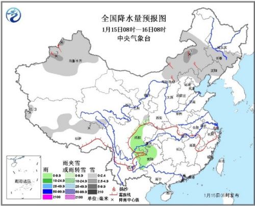 15日08时至16日08时, 新疆北部、内蒙古中部和东南部、河北北部、东北地区中南部、西藏中部和东北部等地有小到中雪或阵雪;四川盆地西部、贵州中西部等地有小雨或阵雨。新疆西部、内蒙古中部等地有4~5级风。