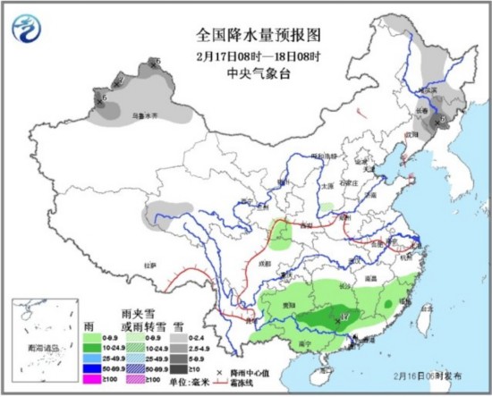 17日08时至18日08时,新疆北部和沿天山地区、青海西南部、东北地区中北部等地有小到中雪或雨夹雪,其中新疆西北部、吉林南部等地的部分地区有大雪;西北地区东南部、云南东部、贵州大部、江南西部和中南部、华南大部等地有小雨,局地有中雨。内蒙古中部、辽东半岛、山东半岛等地有5~6级风。