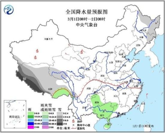 未来三天具体预报方面,3月1日08时至3月2日08时,东北地区东部和北部、西藏大部、青海南部等地有小到中雪,其中,西藏南部的部分地区有大到暴雪,局地大暴雪(20~28毫米)。南疆盆地、内蒙古西部局地有扬沙或浮尘。内蒙古西部、甘肃河西等地有5~6级偏北风。东海南部、台湾海峡将有7~8级、阵风9级的偏北风。
