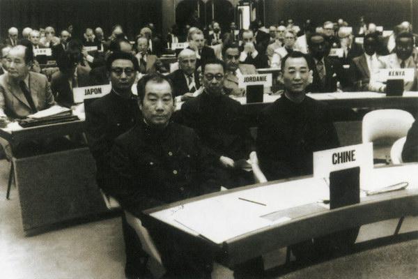 中国政府代表团参加1972年联合国人类环境会议。前排右一为曲格平。
