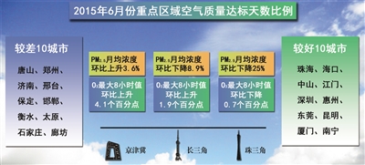 本报记者王昆婷北京报道 环境保护部近日向媒体发布了2015年6月份京津冀、长三角、珠三角区域及直辖市、省会城市和计划单列市等74个城市空气质量状况。