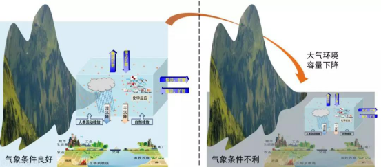 大气环境容量是指城市或区域空气质量达标时,能容纳各种污染物的最大排放量。大气环境是开放、流动的,没有明确的边界,因此大气环境容量会受气候、气象条件等因素影响而动态变化。像下图所示,气象条件有利(如刮大风)的时候环境容量大,遭遇极端不利气象条件时环境容量很小。