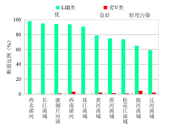 1-5月,长江、黄河、珠江、松花江、淮河、海河、辽河等七大流域及西北诸河、西南诸河和浙闽片河流Ⅰ-Ⅲ类水质断面比例为84.4%,同比上升6.6个百分点;劣Ⅴ类为1.1%,同比下降4.1个百分点。主要污染指标为化学需氧量、高锰酸盐指数和氨氮。其中,西北诸河、长江流域、浙闽片河流、西南诸河和珠江流域水质为优,黄河和淮河流域水质良好,松花江、海河和辽河流域为轻度污染。