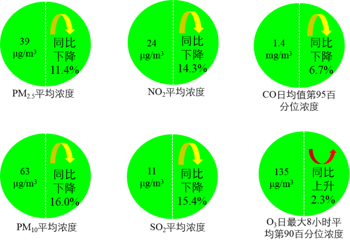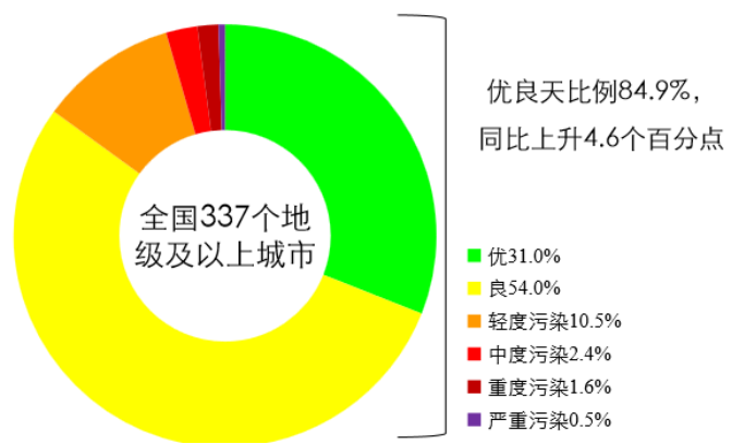 1-5月,全国337个地级及以上城市平均优良天数比例为84.9%,同比上升4.6个百分点;145个城市环境空气质量达标,同比增加27个;PM2.5浓度为39微克/立方米,同比下降11.4%;PM10浓度为63微克/立方米,同比下降16.0%;O3浓度为135微克/立方米,同比上升2.3%;SO2浓度为11微克/立方米,同比下降15.4%;NO2浓度为24微克/立方米,同比下降14.3%;CO浓度为1.4毫克/立方米,同比下降6.7%。