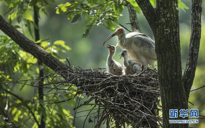 在陕西省汉中市洋县四郎镇田岭村的一片密林里,朱鹮在巢里照看幼鸟(2018年6月2日摄)  新华社记者 陶明摄