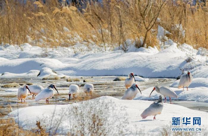在陕西省铜川市耀州区沮河拍摄的朱鹮(2018年1月8日摄)  新华社发(石铜钢摄)
