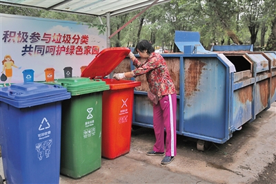 贺玉凤将捡来的垃圾分好类,倒在家门前的垃圾箱里。
