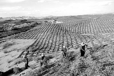 宁夏白芨滩林场职工打草方格治沙。资料图片
