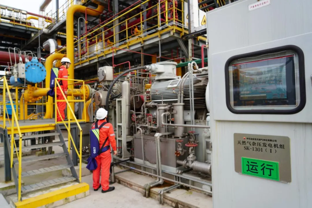 在安岳净化公司两列净化装置的东北侧,各有一台天然气余压发电机组。伴随输气管道中“嘶嘶”的气流声,发电机组的轰鸣声不绝于耳。据悉,每台天然气余压发电机组设计发电功率750千瓦每小时,两台装置设计年净发电量共890万度。