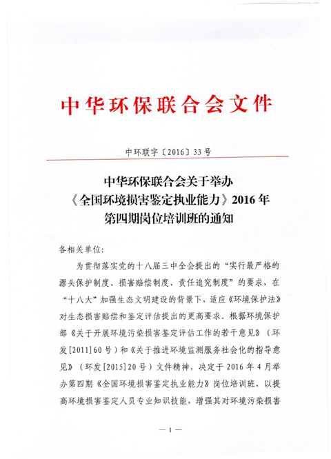 中华环保联合会关于举办《全国环境损害鉴定执业能力》2016年第四期岗位培训班的通知