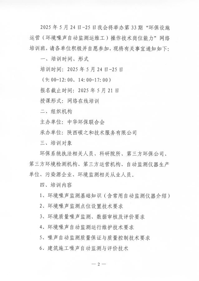 关于举办第33期“环保设施运营(环境噪声自动监测运维工)操作技术岗位能力”网络培训班的通知