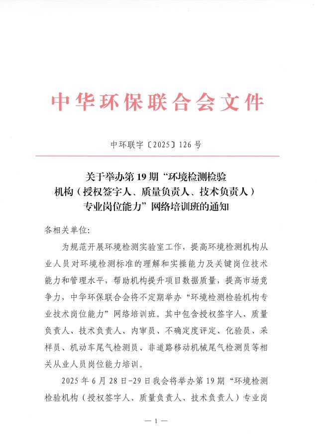 关于举办第19期“环境检测检验机构(授权签字人、质量负责人、技术负责人)专业岗位能力”网络培训班的通知