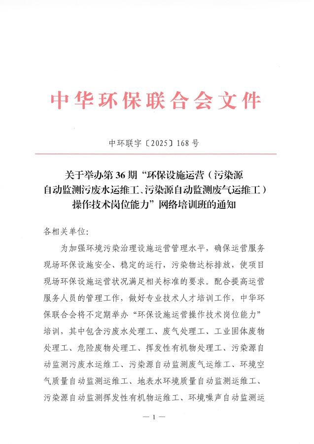 关于举办第36期“环保设施运营(污染源自动监测污废水运维工、污染源自动监测废气运维工)操作技术岗位能力”网络培训班的通知