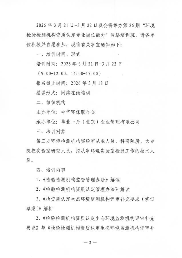 关于举办第26期“环境检验检测机构资质认定专业岗位能力”网络培训班的通知
