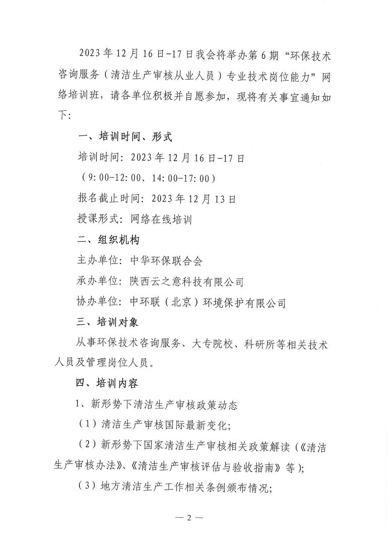 关于举办第6期“环保技术咨询服务(清洁生产审核从业人员)专业技术岗位能力”网络培训班的通知