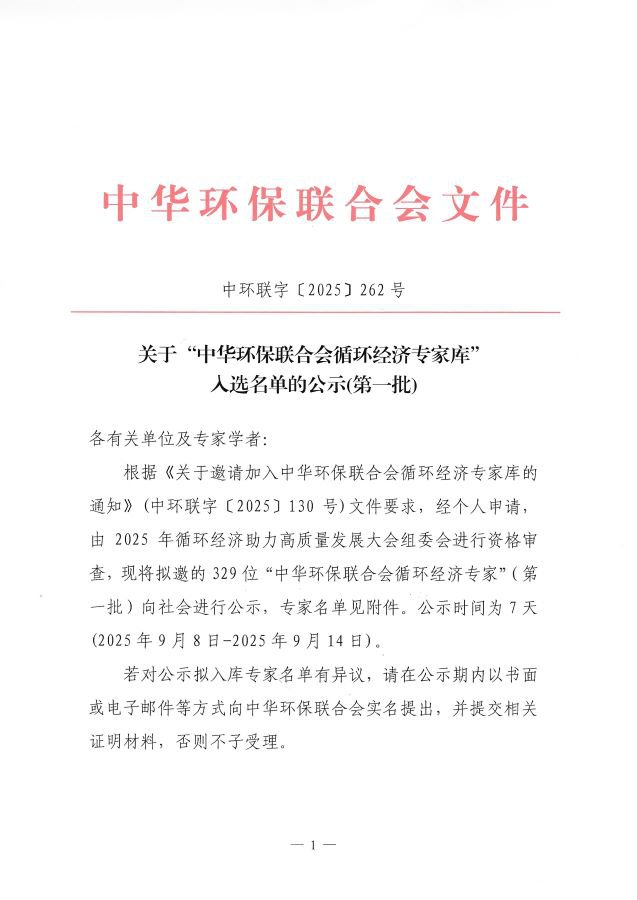 关于“中华环保联合会循环经济专家库”入选名单的公示(第一批)