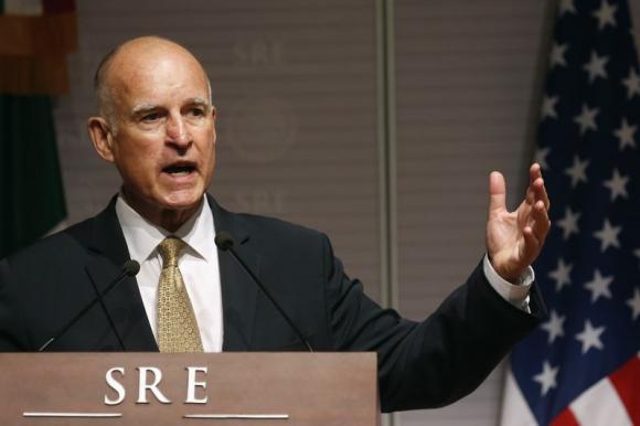 图:7月28日,加州州长杰里·布朗在墨西哥城举行的新闻发布会上发表讲话。图片来源:路透社