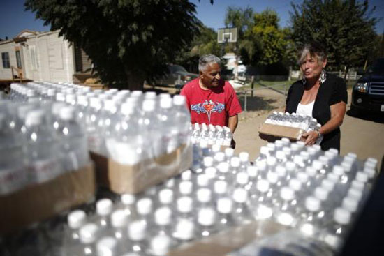 图3:年届七旬的唐娜·约翰逊(右)和68岁的波特维尔居民鲁本·佩雷斯一起,将捐赠瓶装水从她的卡车后厢中搬下来。她每天都会为水井干涸的居民送水。图片来源:路透社